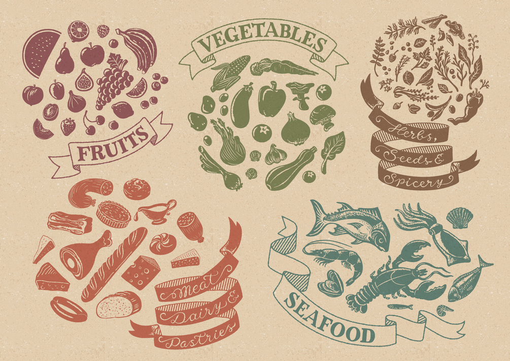 - More than 100 handcrafted vintage vector food silhouettes, assorted in the categories of „FRUITS“, „VEGETABLES“, „HERBS, SEEDS & SPICERY“, „MEAT, DAIRY & PASTRIES“ and „SEAFOOD“, easy to pick, scale and change colors.