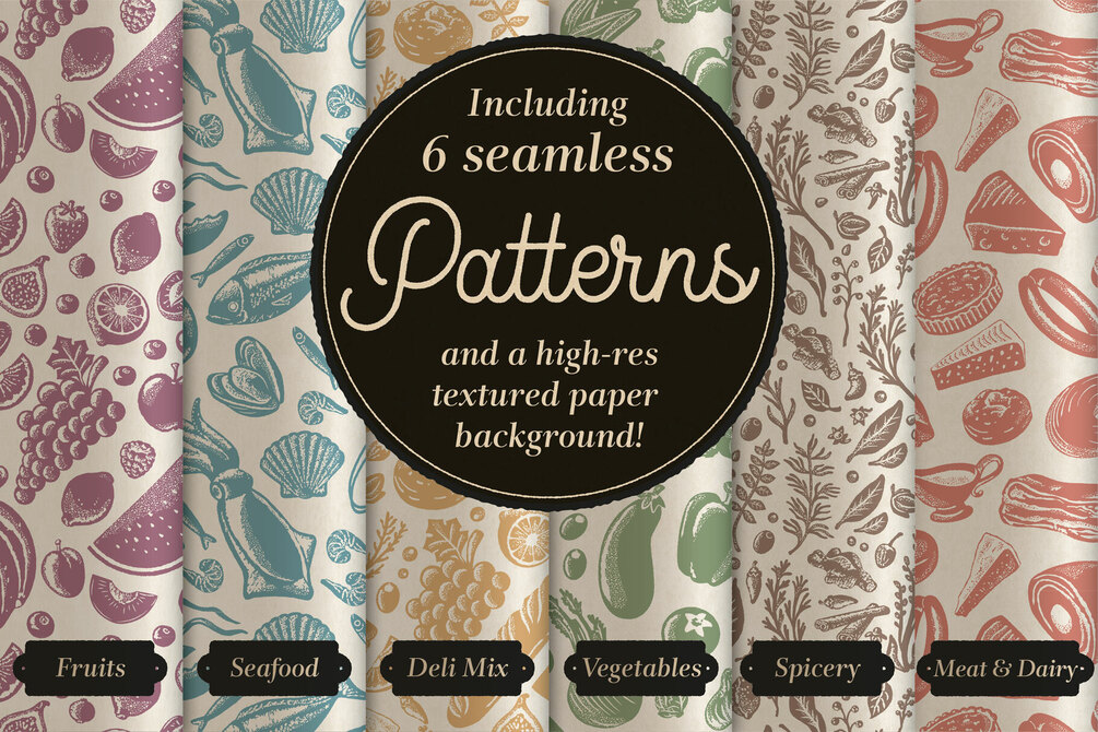 - Including 6 seamless patterns – one of each food category and further more one „Deli Mix“! There are several possibilities to change size or colors of the patterns (separated pattern square, a black version and a separated high res textured paper background (4961 x 3508 px) are provided).