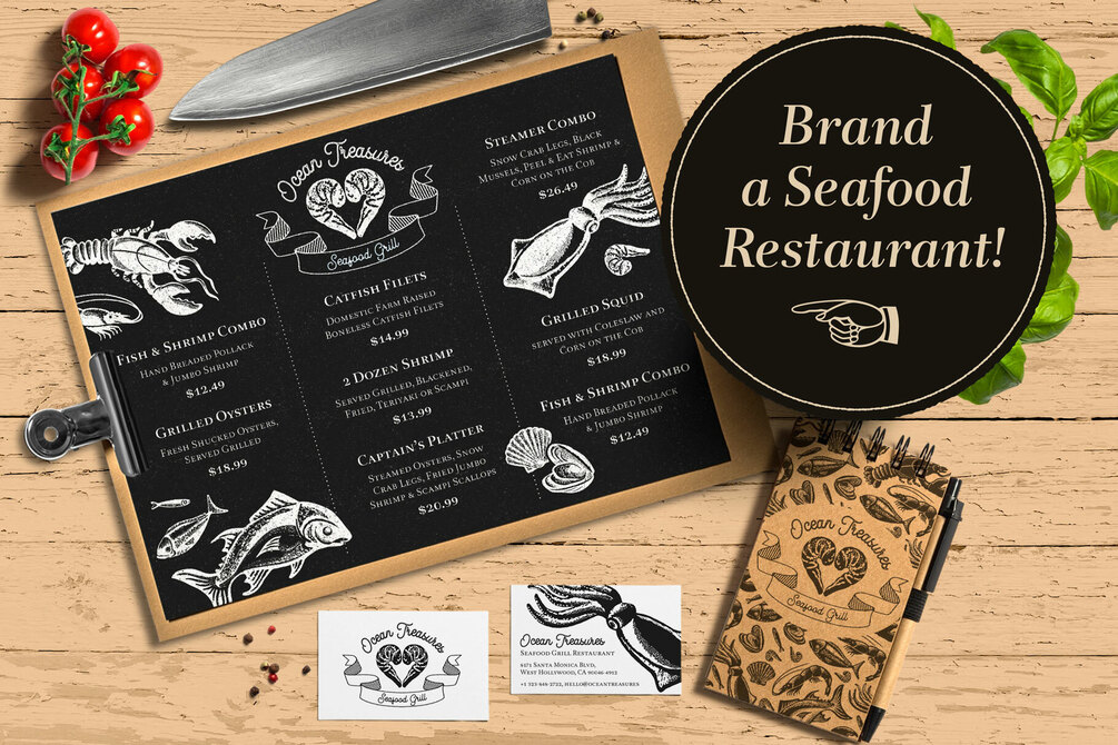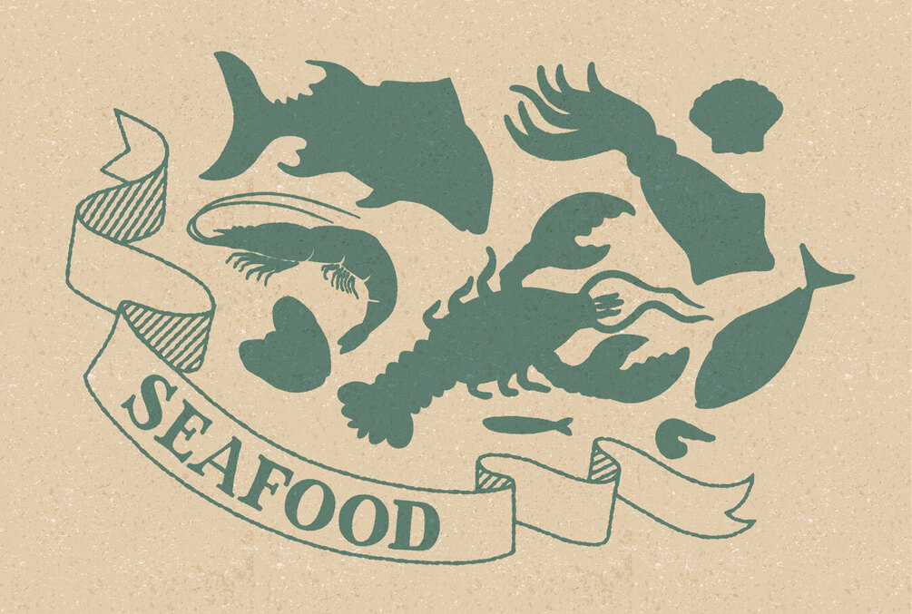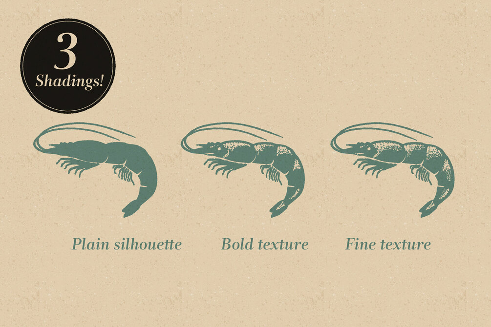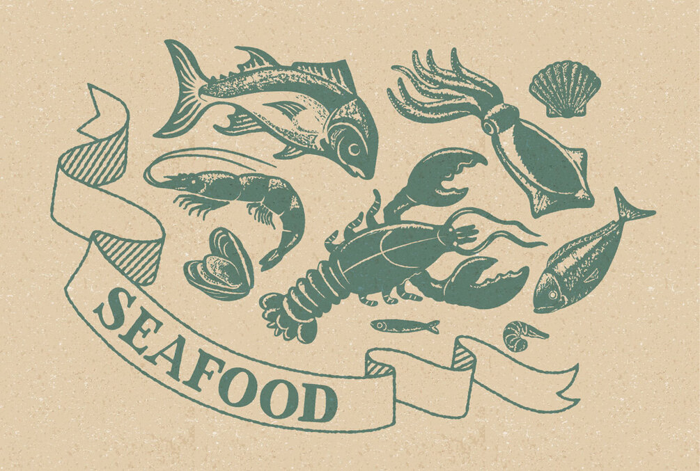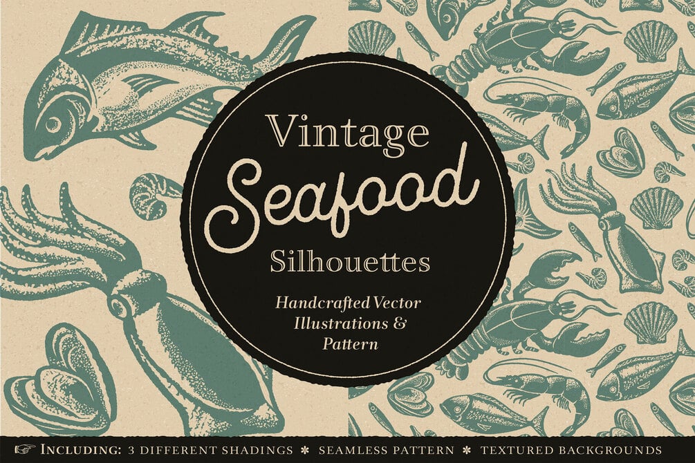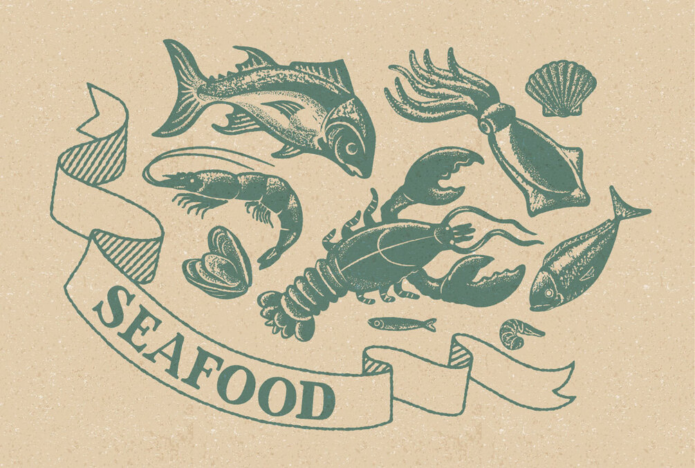- Handcrafted vintage vector seafood silhouettes, easy to pick, scale and change colors.